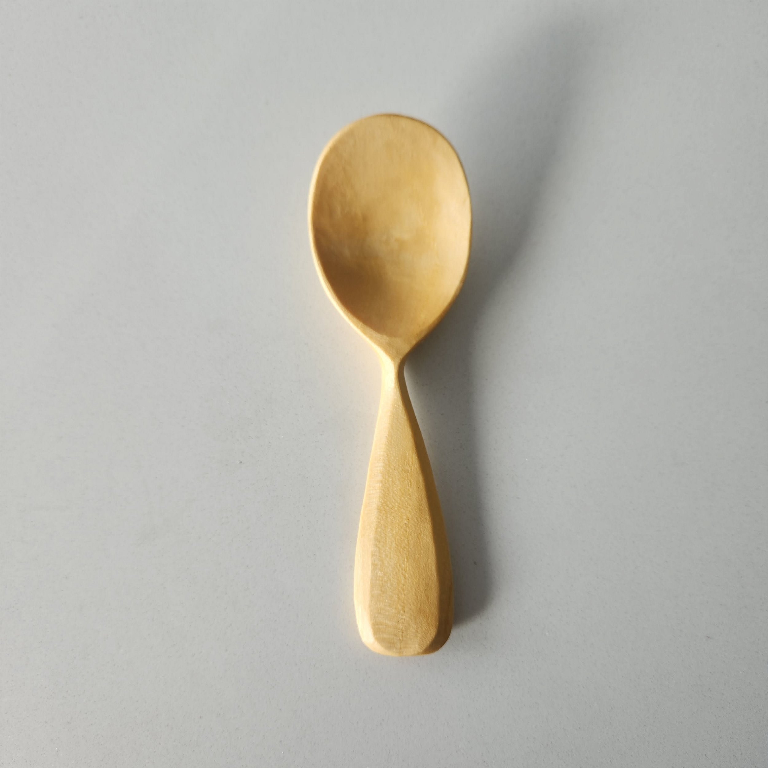 a inclinação mais acentuada ao longo do comprimento da colher (conhecida em inglês como “crank”), é uma decisão formal e prática que facilita o acesso à comida sem sujar as mãos, e é um dos detalhes que diferencia substancialmente uma colher que é pensada para sua finalidade.